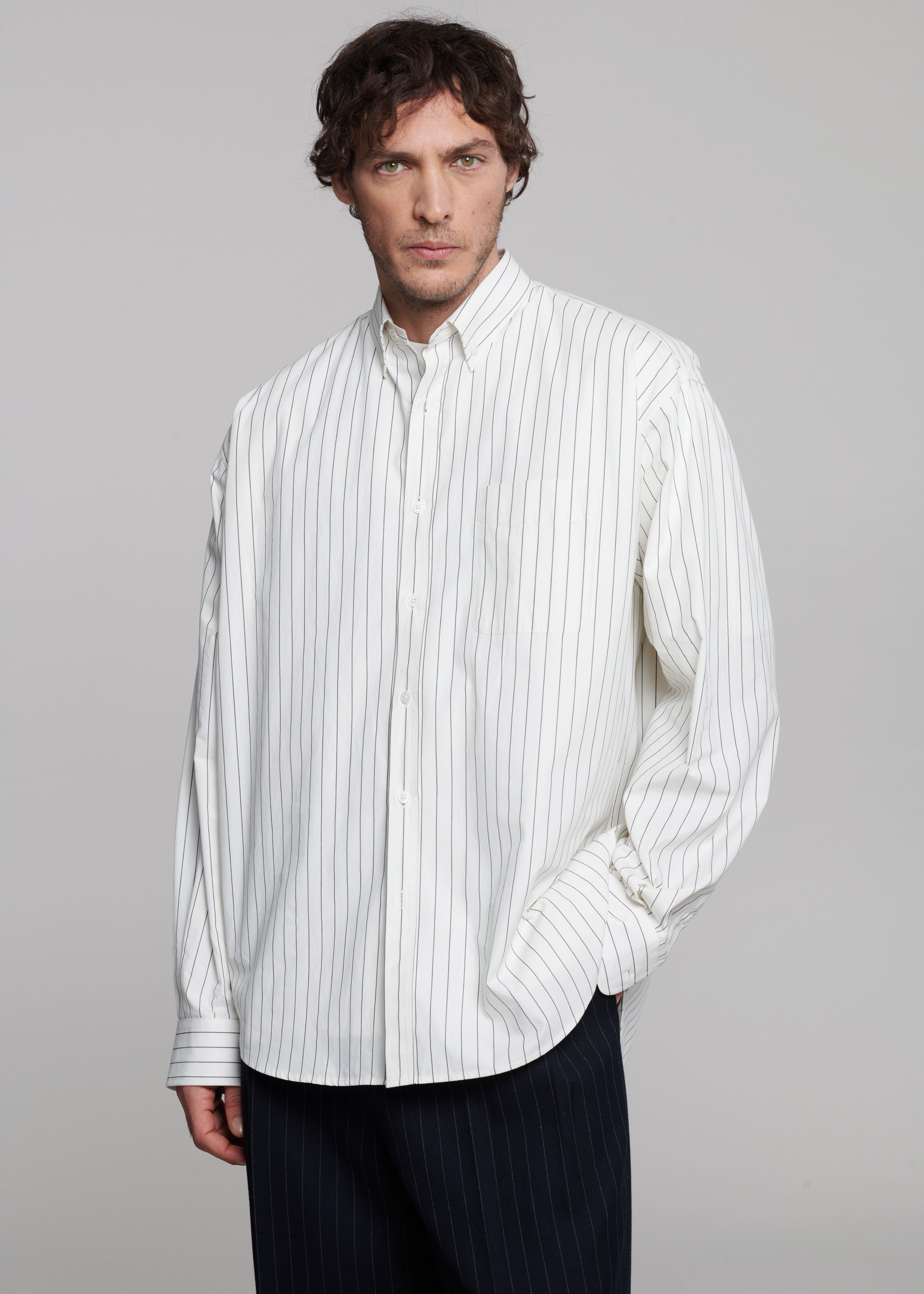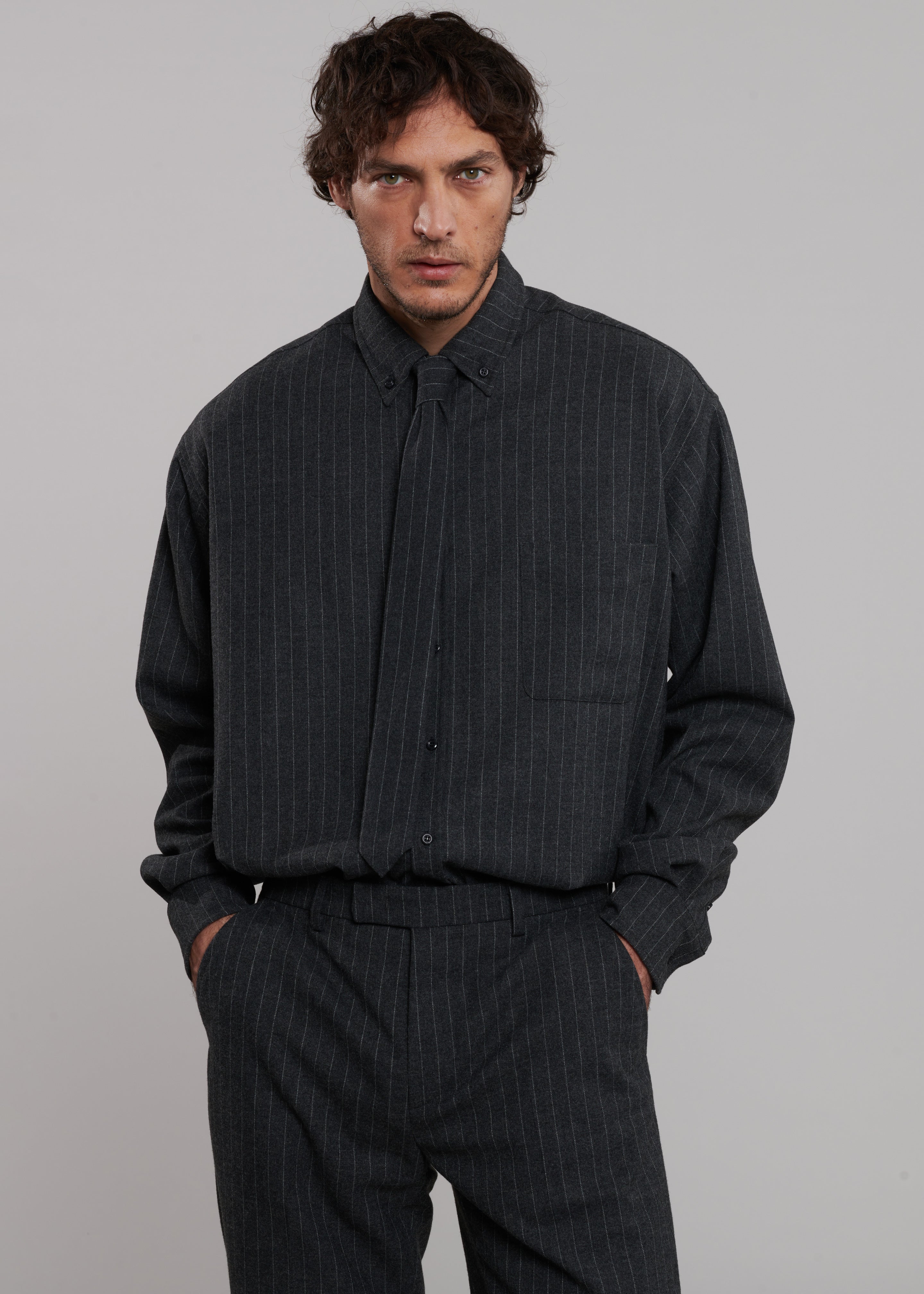 Mason Wool Button Up Shirt - Dark Grey/White Pinstripe